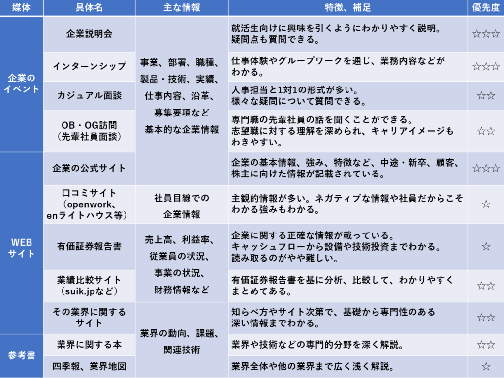 下記に、企業研究に活用できる媒体と、知れる情報、特徴を表にまとめたのでご覧ください。