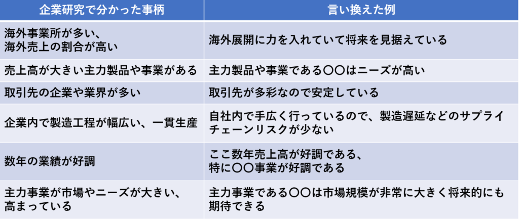 それは、企業研究をして分かった事柄をそのまま伝えるのではなく、企業の強みとして独自に捉え面接用に言い換えをすることです。