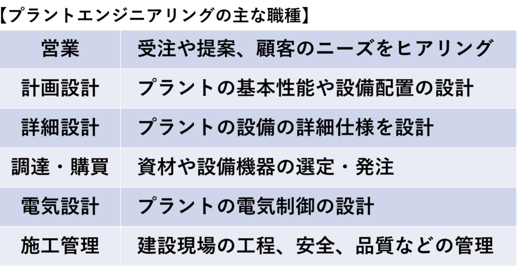 前述したように、様々なプラントがあり、それに応じたプラントエンジニアリングがあります。しかし、プラントを建設するという点は共通しているので、業務工程や必要とする職種は同じです。以下に業務工程と職種を説明します。