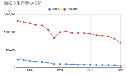 日本の繊維業界は近年は生産量が減少傾向にあります。この減少は、多くの要因に起因していますが、特に労働コストの上昇と近隣諸国の伸びが影響しています。