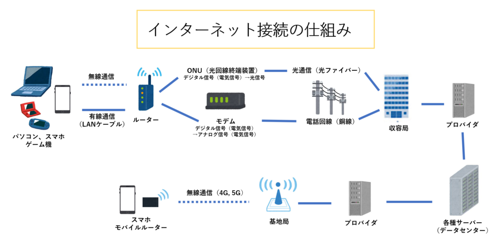インターネット接続は上記の図のような流れで行われます。パソコンやスマホなどの情報機器からの通信方法は、有線通信と無線通信(wifi、4G、5G)があります。