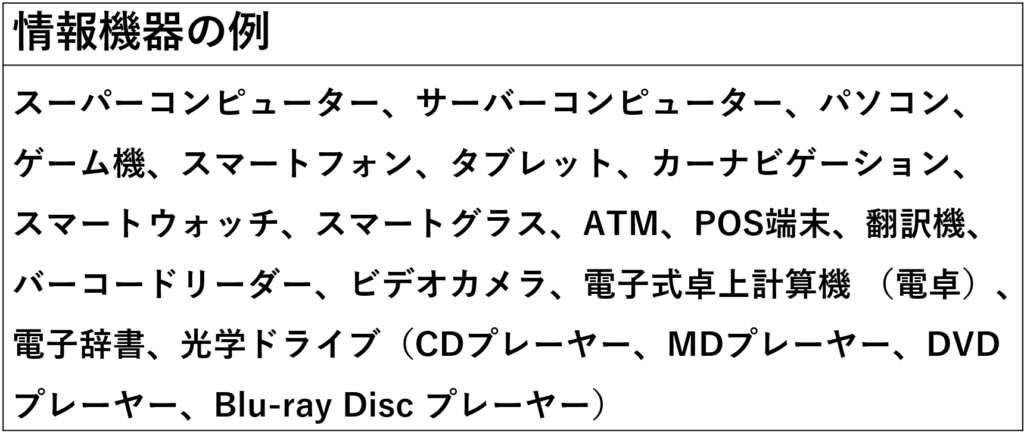 情報機器とは、主に情報の処理、保存、入出力、伝送などの機能を持つ電子機器のことです。情報機器にはパソコンやスマートフォンなどのコンピュータを内蔵した機器やその周辺機器などが含まれます。