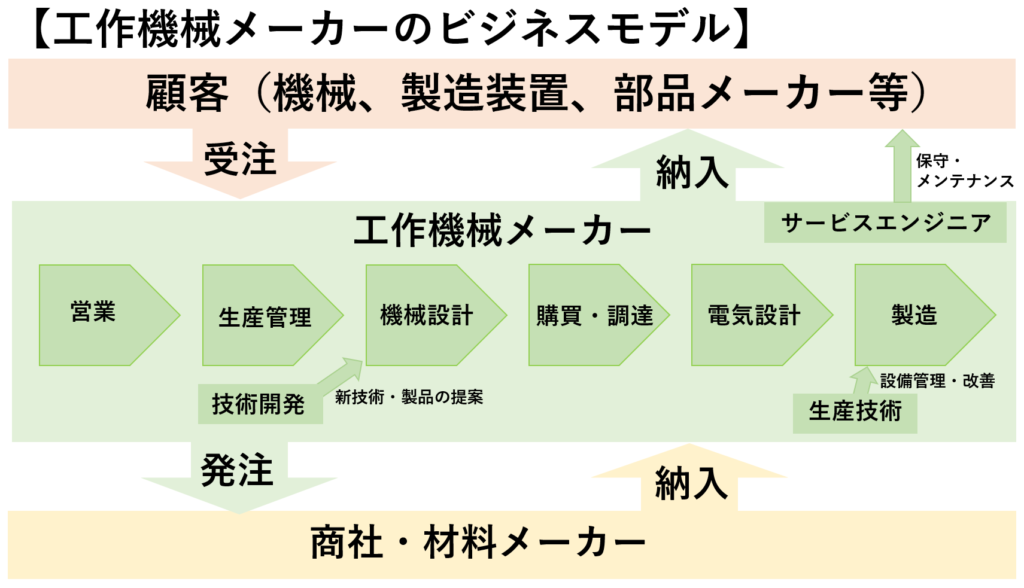 顧客から受注した要件を基に設計し、商社・材料メーカー等から仕入れた材料・部品を加工して組み立てることで工作機械を作り、顧客の工場に納入するという流れになります。