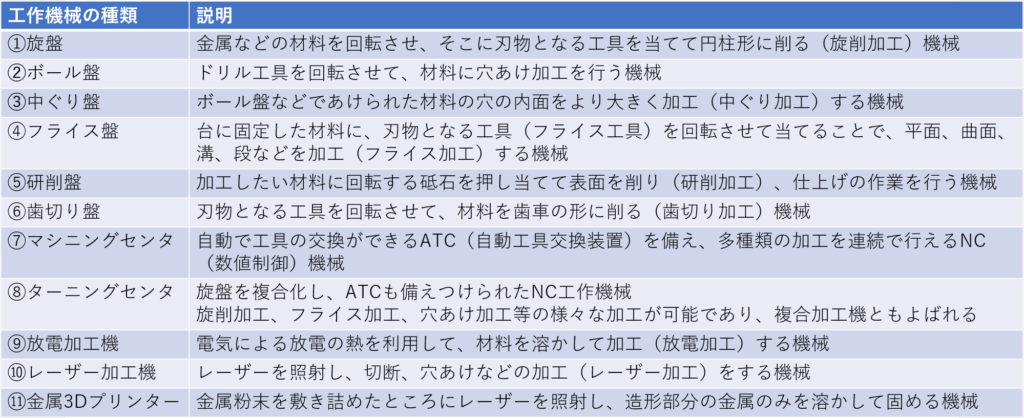 数ある中でも、活躍の場面が多い代表的な工作機械を表にまとめました。
