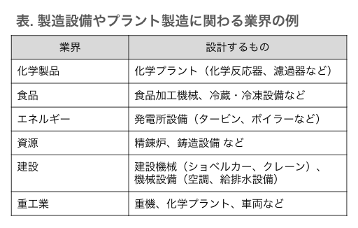 製品を作る設備やプラント製造に関わる業界としては、化学プラントを設計する化学製品業界、食品加工機械を設計する食品業界、発電所等を設計するエネルギー業界、建設機械や建物内の設備設計をする建設業界、重機や化学プラントなど大型機械全般を製造する重工業業界などが挙げられます。
