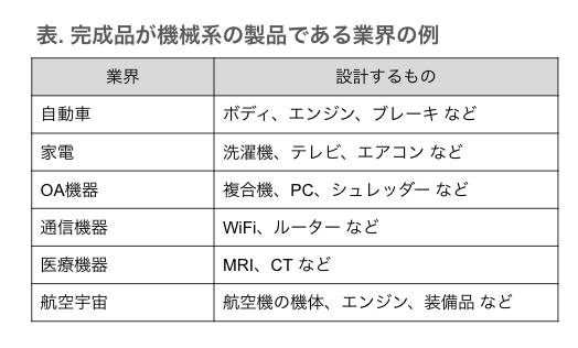 完成品が機械系の製品である業界として、自動車業界、家電業界、OA業界、通信機器業界、医療機器業界、航空宇宙業界などが挙げられます。