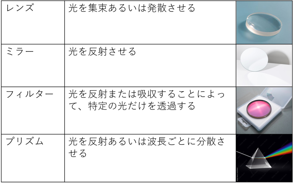 基本的な光学部品はレンズ、ミラー、フィルター、プリズムがあります。