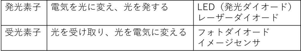 光半導体は発光素子と受光素子の二つに分類され、それぞれの機能は以下のようになります。