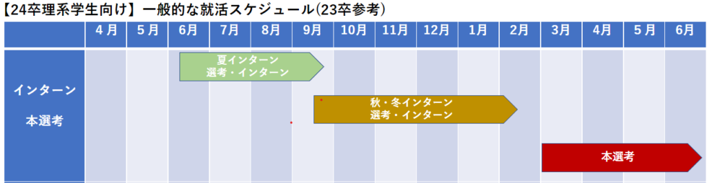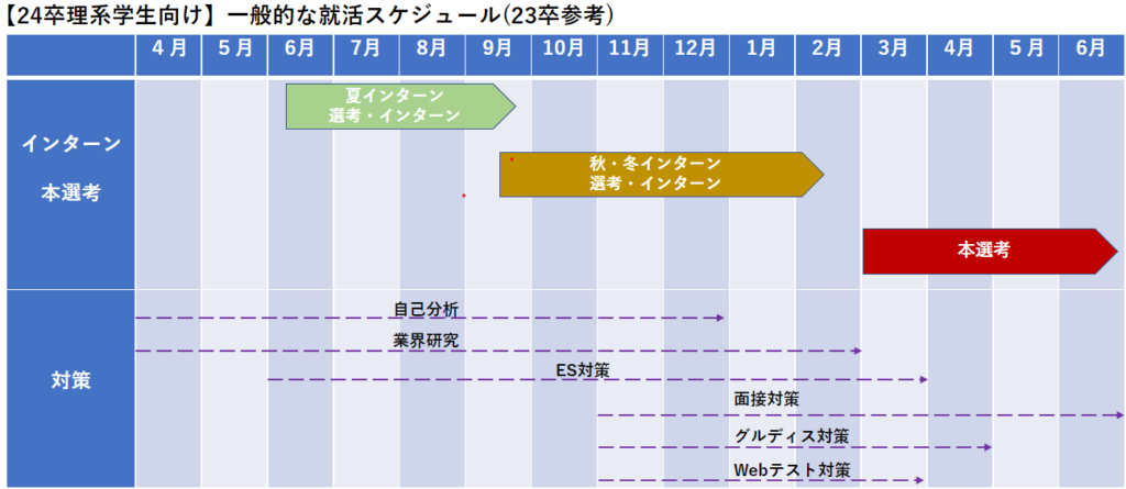 こちらは一般的なスケジュールであり、外資企業やベンチャー企業は早期に本選考を始めることもあります。