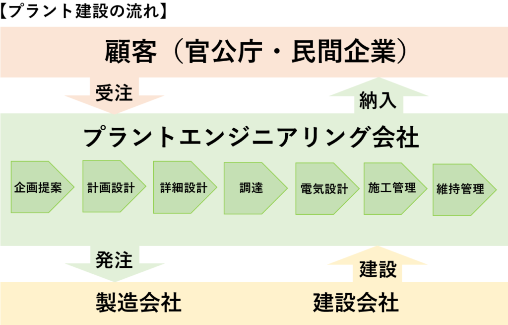 つまり、プラントには様々な種類があるため、それを建設するプラントエンジニアリングも建設する施設ごとに分かれています。産業用の工場を建設する企業もあれば、浄水場や下水処理場といった水処理施設を建設する企業もあるということです。