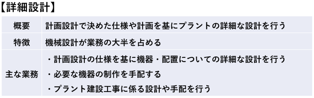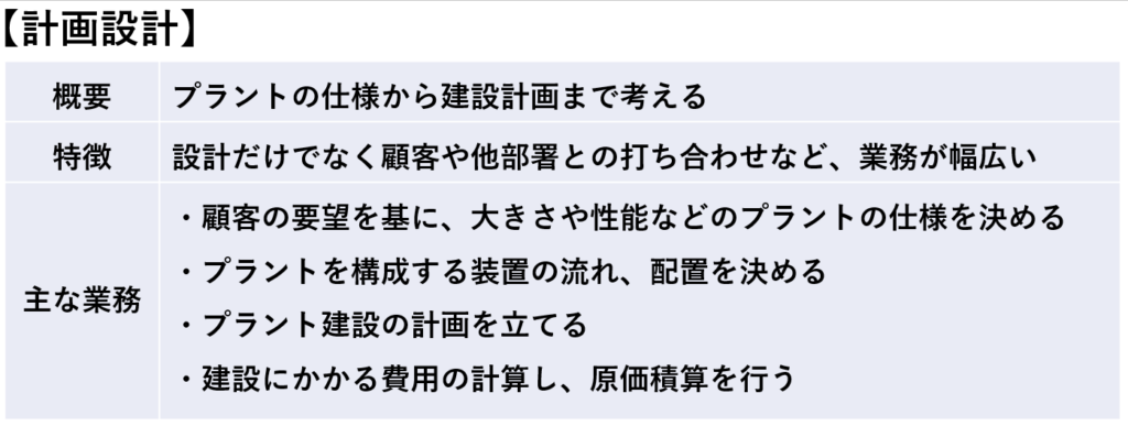 それぞれを簡易的に表現すると、「計画設計」はプラントの大まかな設計、「詳細設計」はプラントの細かな設計を行う職種になります。